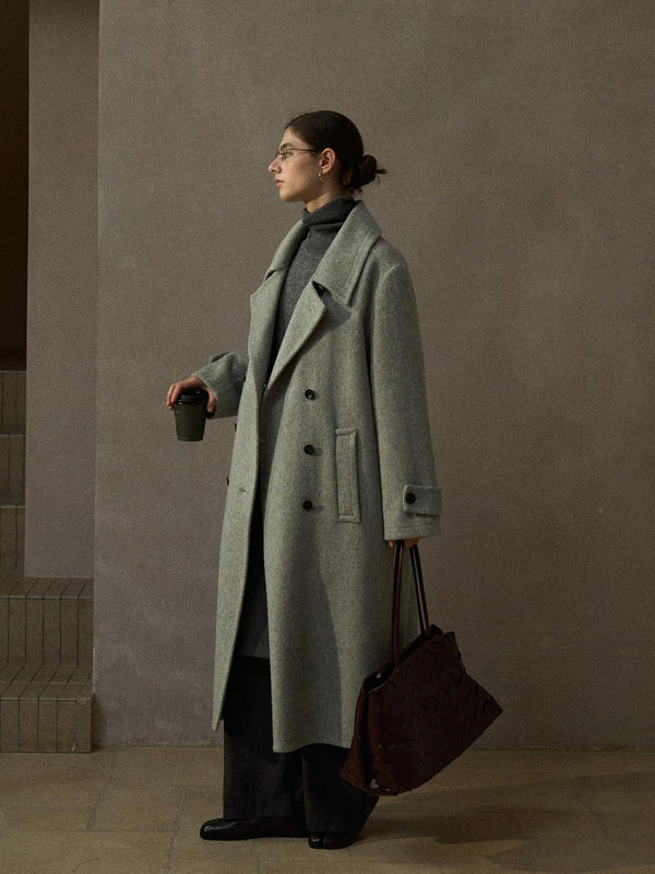 Double-breasted wool coat with long length and quiet, tailored structure.