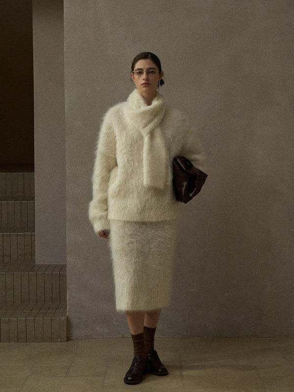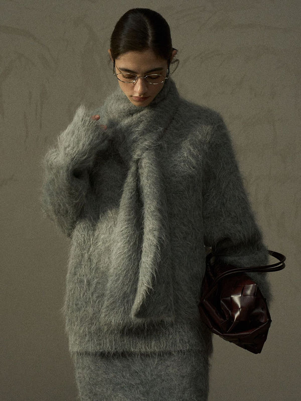 Soft Suri alpaca knit with scarf-neck design for quiet warmth and ease.