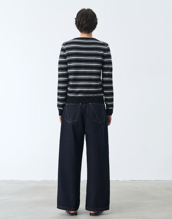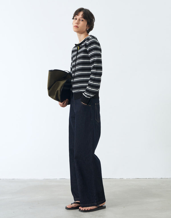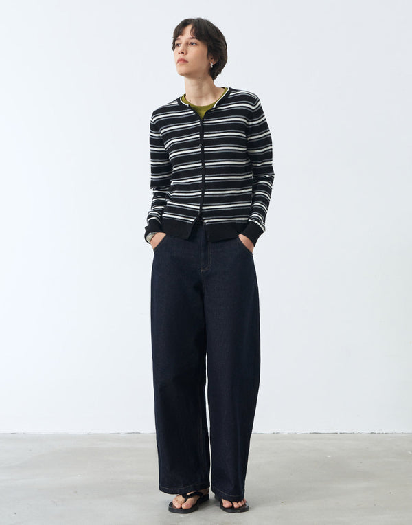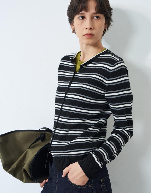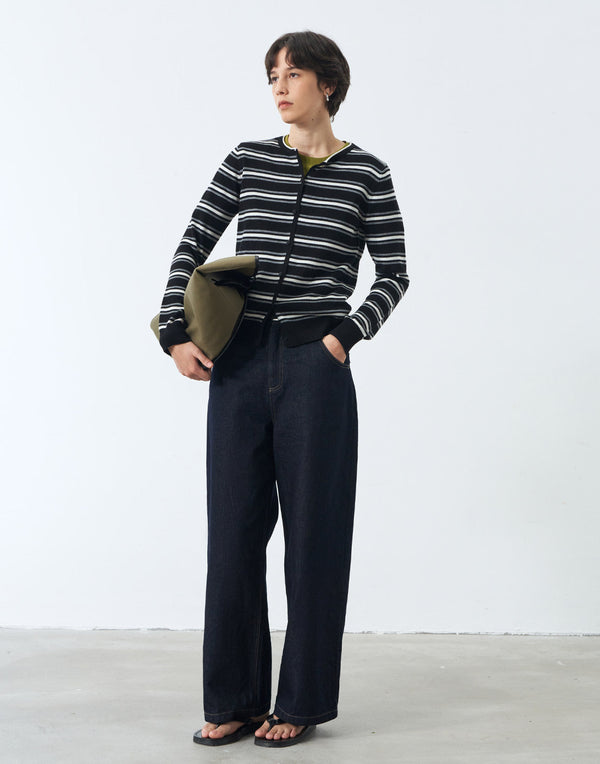 Timeless striped knit cardigan with sleek straight-fit silhouette.