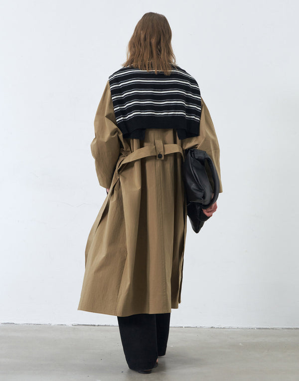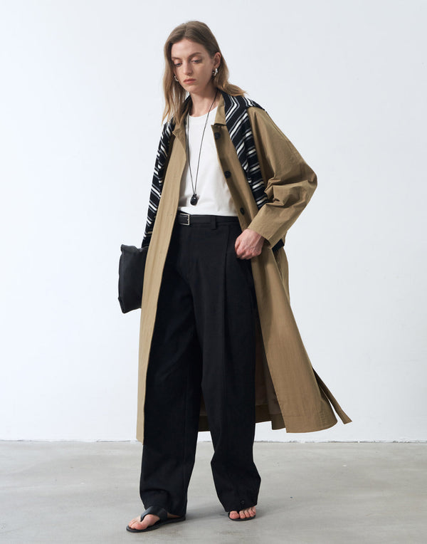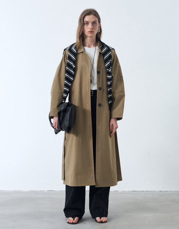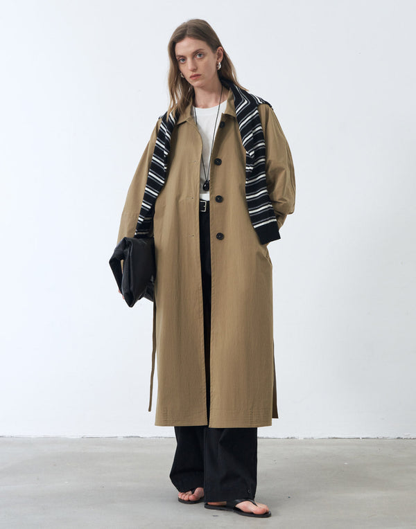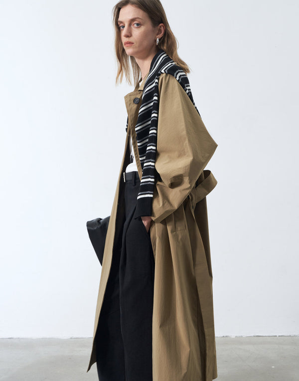 Minimalist trench with cocoon silhouette and refined washed cotton.