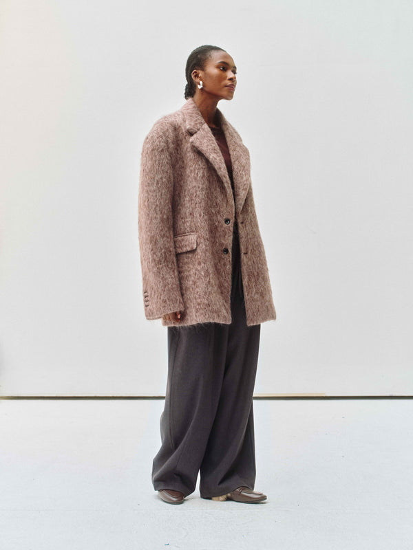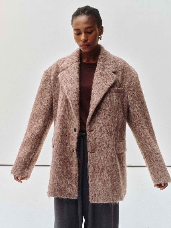 Plush wool-blend coat with soft texture and modern oversized tailoring.