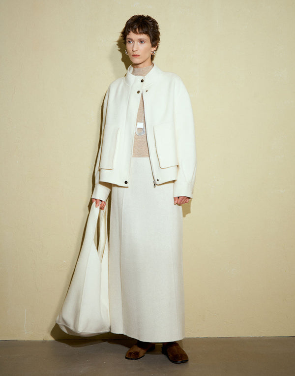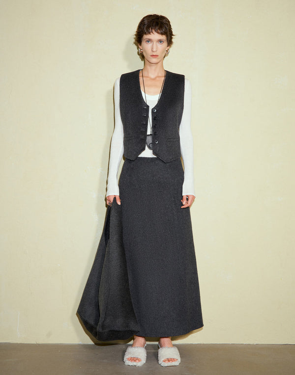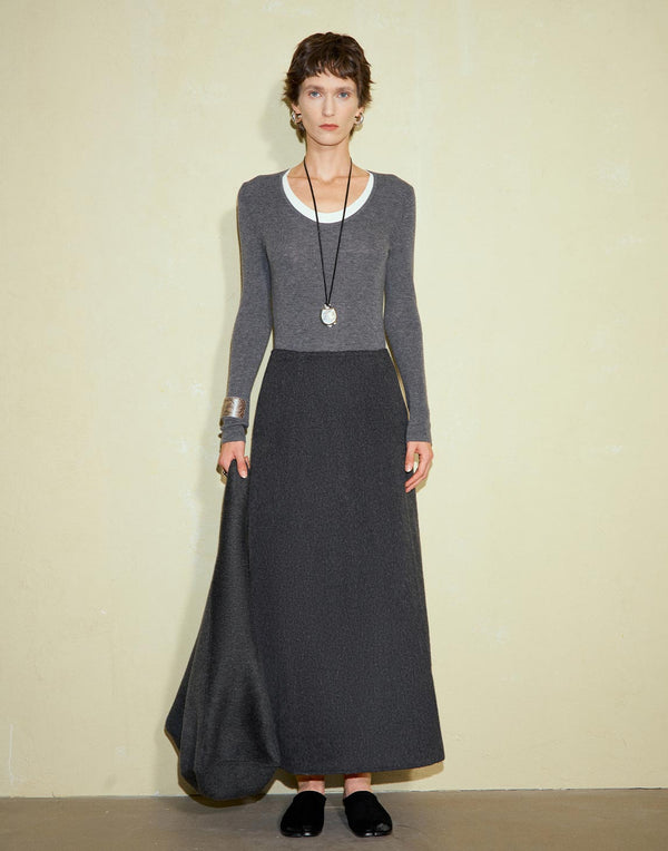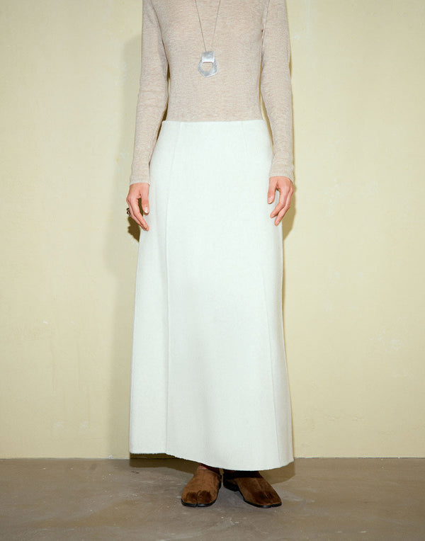 Wool-camel maxi skirt with sleek panels and timeless cut.